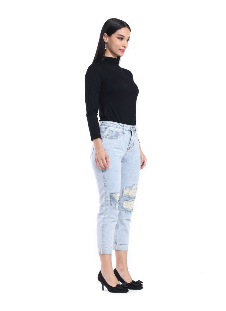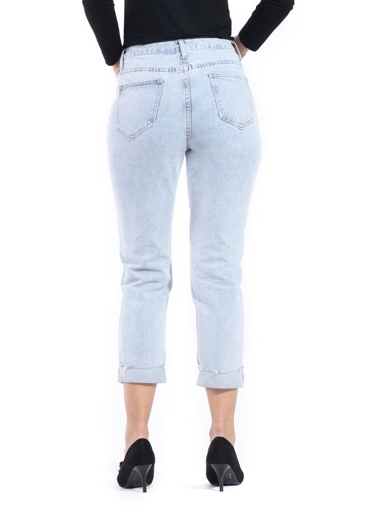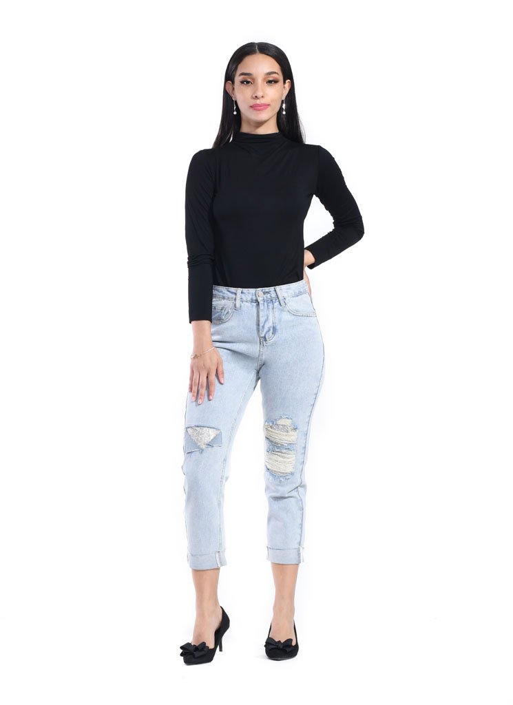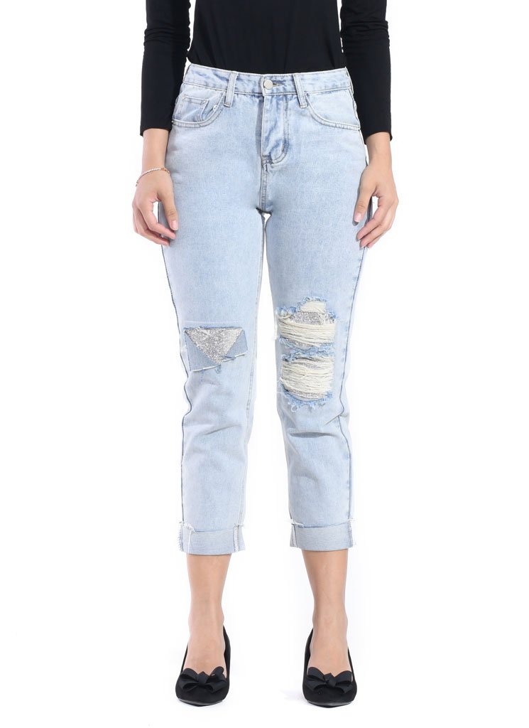 – Ripped jeans with stones beading – High rise – Unlined – Carrot cut – Button and zip fastening – Back pocket style – Cotton
